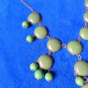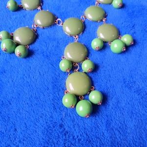 A nice statement piece. This has two different colors of green acrylic bubble pieces. Connected together in a nice bib style necklace.