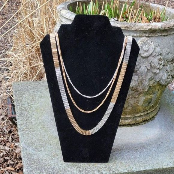 This silver and gold tone necklace is 32 inches long with a lobster claw clasp and three strands.