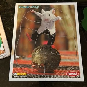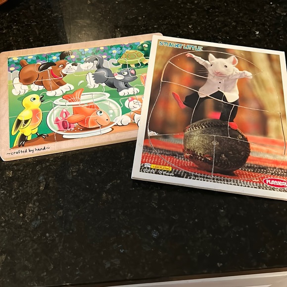 1. Handcrafted pets by Melissa and Doug. 2. Stuart Little by Playskool. About 11.5x 9.5. Appear to be wooden trays?