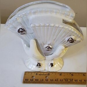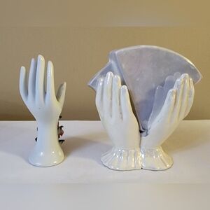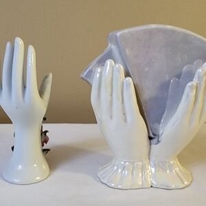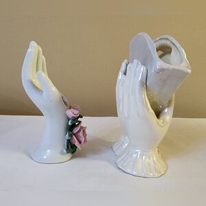Set of 2 vintage porcelain 60s-70s Floral hand vases. 1 floral hand vases with heart cut out in the palm. The second vase is double hands holding cards vase. this vase has a hair line crack on the back of these vase. These vases are old but, still beautiful and unique.