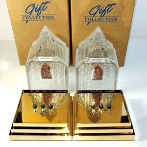 Two vintage Avon gift collection silent night crystal glass light-up church with gold toned rectangular base from 1992
