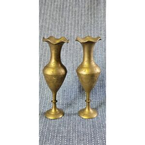 Vintage brass décor is prized for its durability, timeless appeal, and craftsmanship. The detailed etching on these vases makes them stand out as elegant and collectible pieces that never go out of style. Each is stamped on the bottom with India.