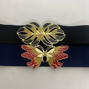 Two Vintage Elastic Belts with Gold Tone Enamel Buckle up to 30"in