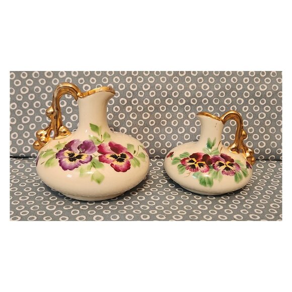 Two ~ Vintage Le Pere Mini Hand Painted Pansy Pitchers/ Vases with Gold Trim