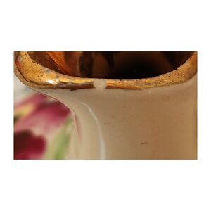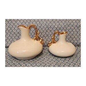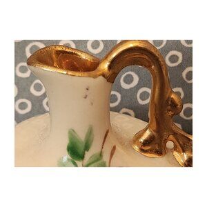 Includes two hand painted Pitchers/ Vases. One is 3.5in tall, and the other 3in tall. These are really beautiful! They are both still in pretty good condition. The 3.5in one has a small chip at the top on the rim. There are some tiny marks on both. Please view all the photos for full condition. They appear to be made of ceramic. Dimensions: #1 3.5in tall, 4in wide. #2 3in tall, 3 1/4in wide.
