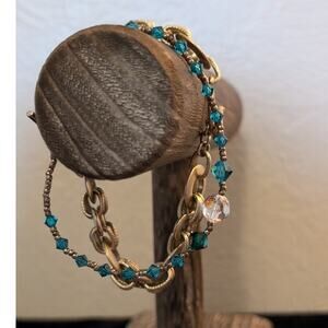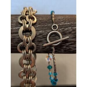 Two Vtg Gold Tone Blue Bicone Crystal & Gold Loop Chain Toggle Bracelets