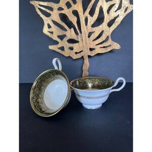 Two Wedgwood Dark Green Florentine Peony Shape Footed Porcelain Teacups England