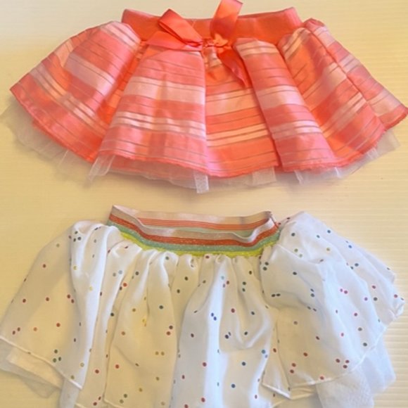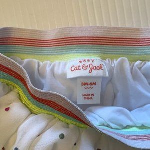 1st one is white background with multicolored dots and striped waist band. It is made by Cat and Jack and is made of polyester and cotton.
