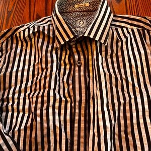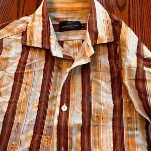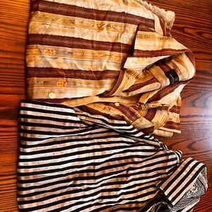 These shirts are by the designer Bugatchi and are both long sleeve. The brown hued shirt is mixed with blue and flecks or orange while the black and white check has tones of blue and grey with a box designed on the fabric. Both freshly laundered and from a pet and smoke free home. Black shirt is L and the Brown is medium
