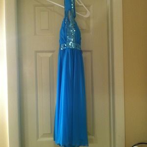 Leopard print dress is knee length and spaghetti straps with cute circles in front of straps. Blue dress is also knee length and halter top. Both only worn once!