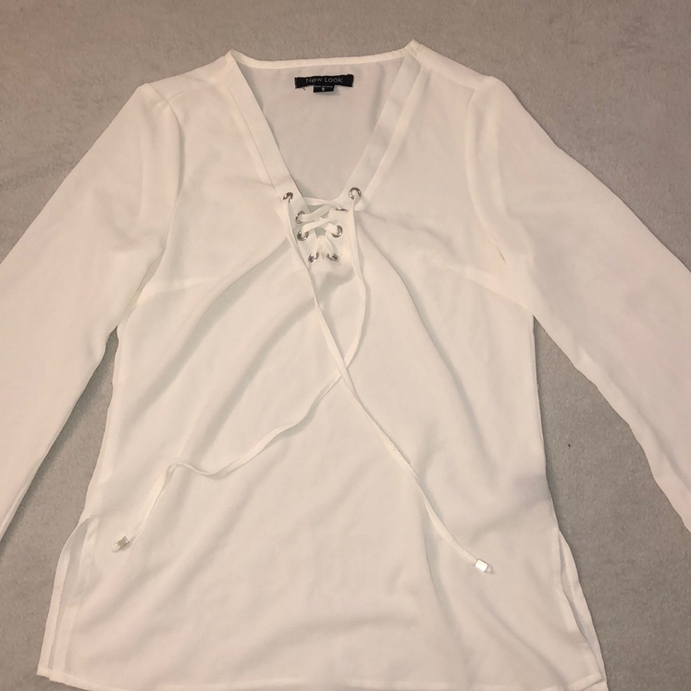 Two lightweight blouses one in a blush pink and the other in white both have crisscrossed strings with metal embellishment