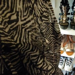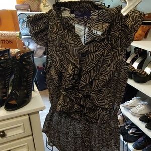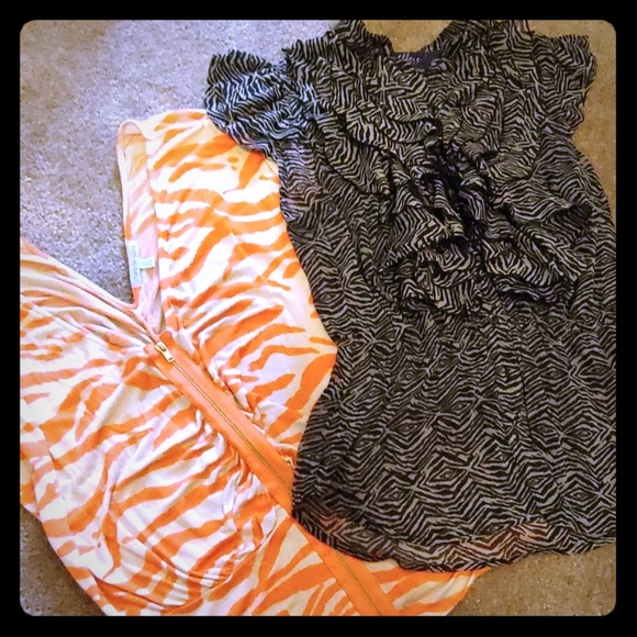 Zebra print blouses blacl/white ruffle chest fitted waist (Miley Cyrus) missint top button and a minor rip on ruffle. Worn you'll barley notice the two imperfections. Orange open chest with front zipper can wear dressed up or down (Charlotte Russe)