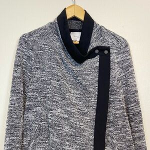Stylish Vince Camuto asymmetrical knit jacket in black & white marled pattern with contrast black trim. Features funnel neck with snap closure, side pockets, and modern silhouette. Size M. Perfect for layering casual or office chic looks.