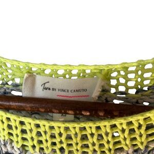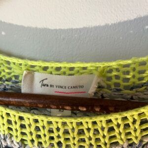 Two by Vince Camuto Open Knit Boatneck Sweater. Blue and white open knit with brat green neck and shoulder line. Excellent preloved condition. Brand tag is coming a bit loose. 3/4 Sleeves. Vented. 100% Cotton Flat Lay 28” L, 18” P-P.