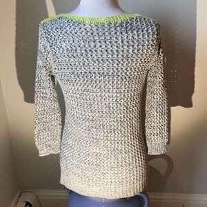 Two by Vince Camuto Open Knit Boatneck Sweater. Blue and white open knit with brat green neck and shoulder line. Excellent preloved condition. Brand tag is coming a bit loose. 3/4 Sleeves. Vented. 100% Cotton Flat Lay 28” L, 18” P-P.