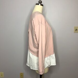 Really pretty and flattering Two by Vince Camuto top. Pullover. Split tulip design back. Lightweight white cotton peplum. Pink material is a heavier sweatshirt material. Perfect for the office or pair with jeans! Cozy and chic!