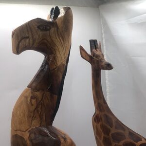 Two beautiful hand carved wooden giraffe figures! No markings. Both have beautiful details, possibly carved in Africa.