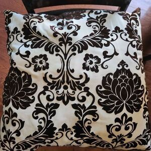 Two dark brown and off white damask pattern pillows.