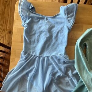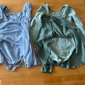 Two girl dance leotards with attached skirts. One long sleeve and one short sleeve. Moderate wear with no stains. Size tags have been removed, but they fit my daughter when she was a 6x-7.