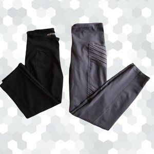 This bundle is the ultimate deal! One pair of black cropped leggings with a hidden waist pocket perfect for stowing away a key or some cash (size small) and a pair of full-length gray leggings that have a fashionable twist (size medium but fit small).
