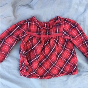 Two girl shirts sizes from 12 - 24 months. The brown with the flower design is 12- 18 month from old navy and the red one is 18-24 months from Gymboree.