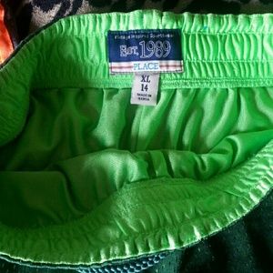 Orange and gray and green with lime green, from the children's place size is 14 they are pretty slim and go up to knee, elastic waist with string..nothing wrong with it , im just going trough what they dont use no more...pet/smoke free home