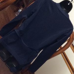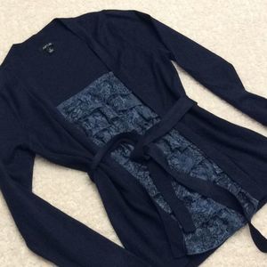 Preowned in very good condition. Knitted part 70% rayon, 30% nylon, woven 100% polyester, ruffled front