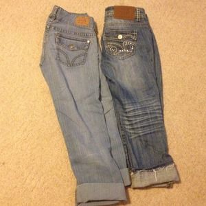 Two jean Capri pants, both light wash, Almost Famous capris are size 3 and has bedazzled butt pockets, w torn jean look. The other is YMI and are size 5, tight light wash! Both very comfy!