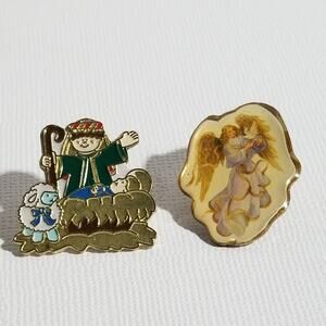 Two lapel pins angel w/ dove Baby Jesus w/ shepherd boy 1" 1.2046