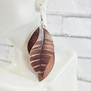 Two layer Brown Feather Print Faux Leather Dangle Chic Lightweight Earrings 2br3
