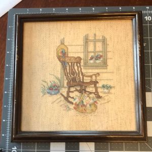 9x9 rocking chair including frame "Garden's Bounty" framed at Jacki's Place in Uniontown, Ohio has a small tear in the brown paper backing/wire hanger