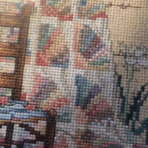 Two matching framed cross stitch pieces depicting flowers/antique chairs/quilt