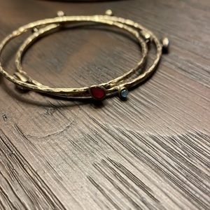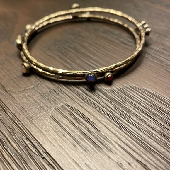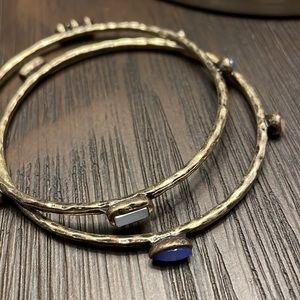 Set of two bejeweled bangles Hammered gold color Multicolored gems
