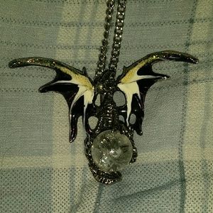A purple and cream colored dragon, butterfly necklace and an an and berry bracelet.