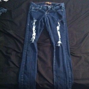 Black pants are high-waisted and jeans have rips
