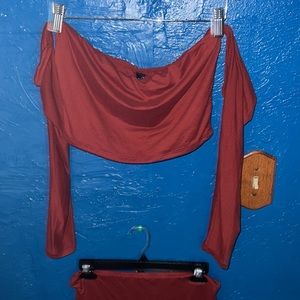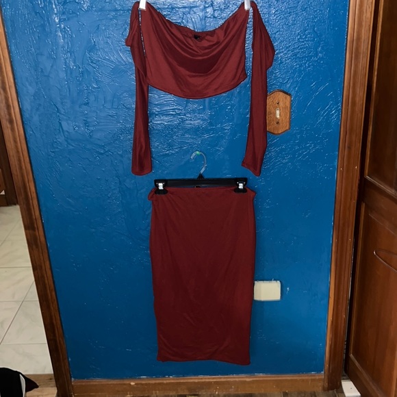 Very cute two piece top by Windsor to talk with sleeves, but no shoulder skirt very fitting body con skirt