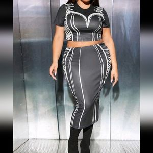 this black and white two piece stretches. it's new I have removed the tags bc I thought I would wear it but never did and with weight lost it's now too big to me.