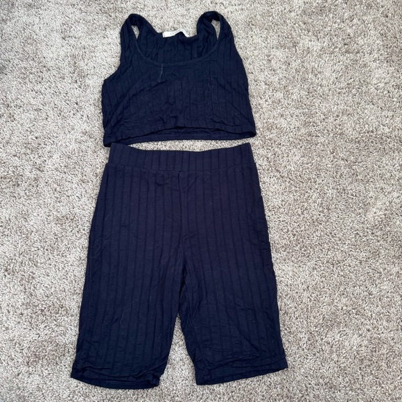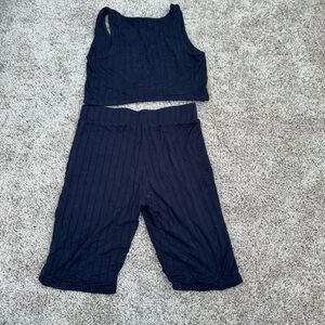 Stretchy and comfortable Comes with a crop top and high waisted shorts Worn but in good condition Navy color
