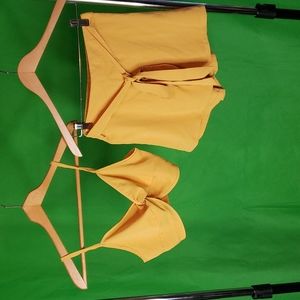 This pretty mustard colored set has a really cute and supportive bra top with elastic high-waisted shorts 15 and a half inches from pit to pit the shorts are 14 inches from top to bottom and 18 inches from hip to hip. No Returns