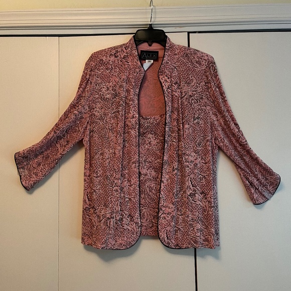 Two piece evening set. Jacket and sleeveless top. Pink and black with glitter. 90% acatate Top is 24 inches long. Jacket is 26 inches long. Sleeves are 20 inches long.