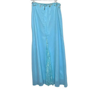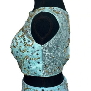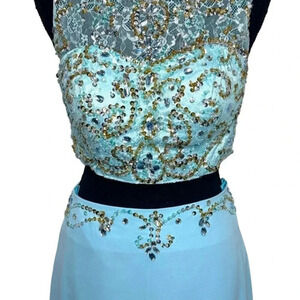 Two piece ice blue Prom dress scoop sheath with beading + sweep train