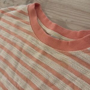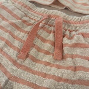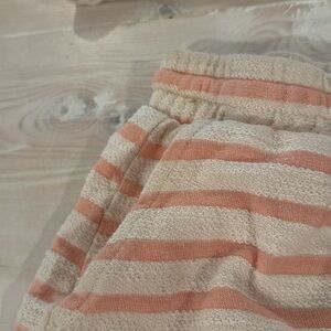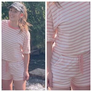 Cream and peach striped two piece outfit. Fits like size small; labeled XS. Boxy fit top and drawstring shorts with 2.5” inseam and pockets. Top is 22” across the bust and 19” long.