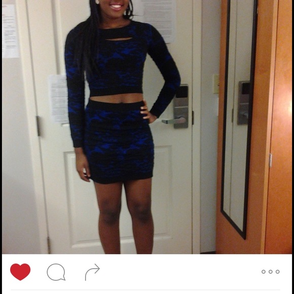 Navy blue and black floral print two piece set. Thick sweater material. The shirt can fit a small to a medium. The skirt can fit a size 6-10, it's stretchy