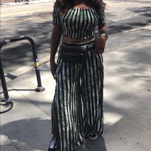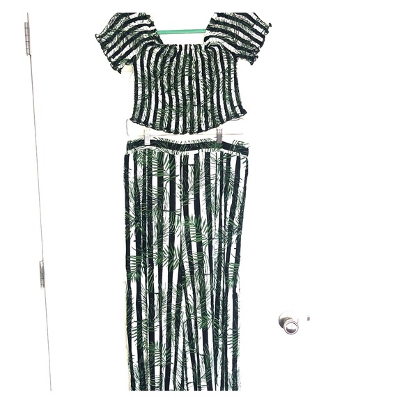 This two-piece set is great from any vacation or simple for spring or summer. The colors are black & white stripped with green plants printed. The top is a stretchy, “off the shoulder” crop top & the pants are wide-leg with a split on each leg. Size large, true to size