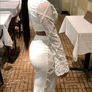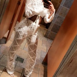 White two piece sequin set. Solid white on backside, front slightly see through. Tie up top. Flare out sleeves