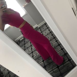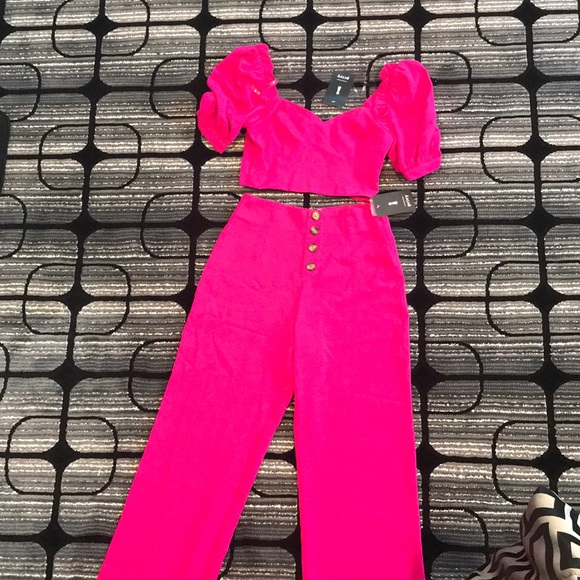 Crop top with puffy sleeve detail with matching high waisted pants.