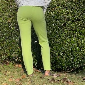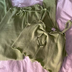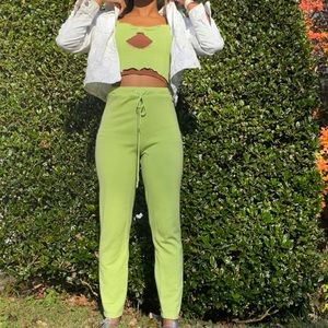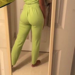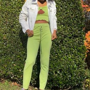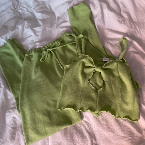 Small knit drawstring set lime green light green nuestras color green fall fit. Handmade with love. This is a sample piece which means it was just me trying out a design. One of a kind with small sewing imperfections . Will fit waist size 22-28 and hips 28-38 maybe even 40 just really tight. Model is 5’4 waist 23 hip 38