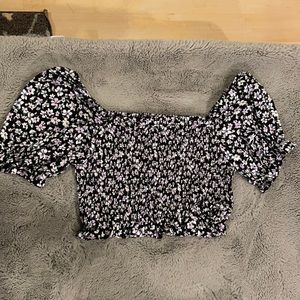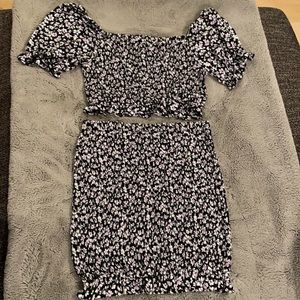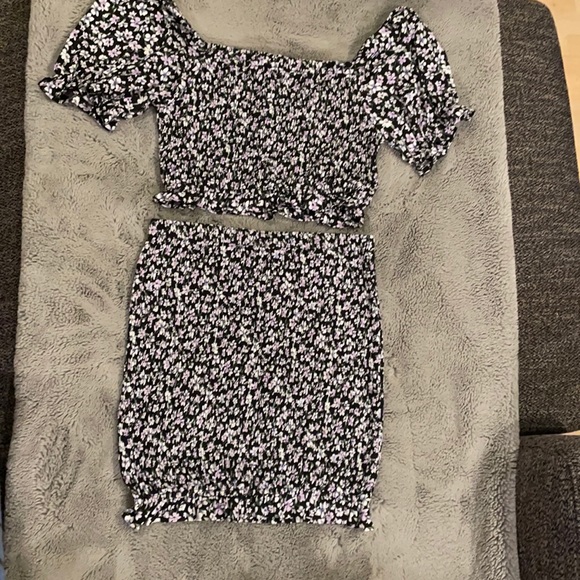 Purple and white flower two piece set. Both supper stretchy. Top is off the shoulder. Skirt is fitted