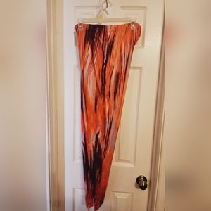 Orange top with hollow out and straps to cinch. Earth tone legging type pants.