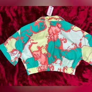 Two piece short set Versace inspired pink green white Button up top and shorts size small never worn